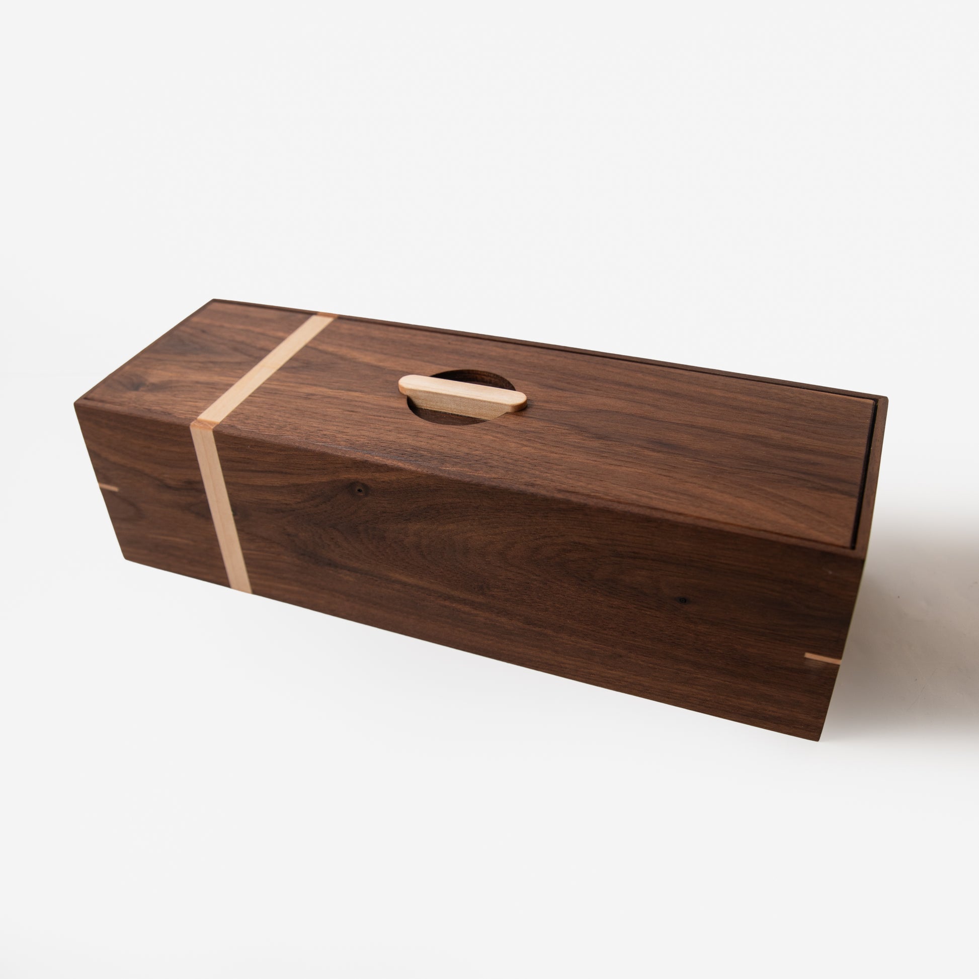 Introduce a touch of elegance to your tea storage with our premium black walnut tea storage box. Handcrafted using the finest materials, this tea storage box is made from premium quality black walnut wood, known for its rich dark color and durability. The box is accented with beautiful maple inlays, adding a touch of contrast and sophistication to the design.